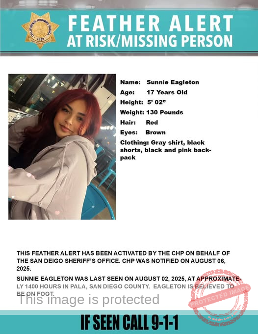 A Feather Alert has been issued for Sunnie Eagleton, a 17-year-old Native American female who was last seen on August 2, 2025, at approximately 2:00 PM on the Pala Indian Reservation in San Diego County, California. Sunnie, who reportedly ran away from the home she was staying at, has not been heard from since. Her family has expressed deep concern for her well-being, especially since this behavior is out of character for her.