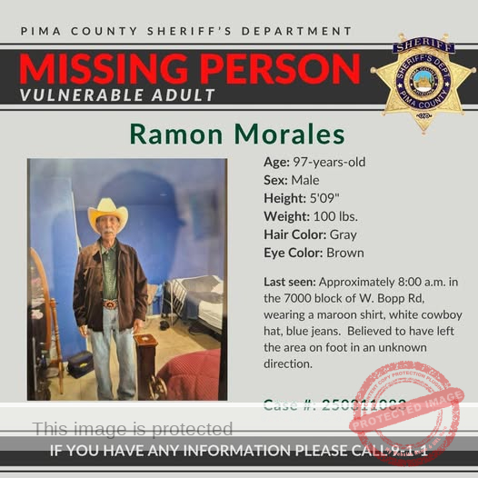The Pima County Sheriff’s Department is urgently seeking the public’s help in locating 97-year-old Ramon Morales, who went missing this morning in the 7000 block of W. Bopp Rd. His disappearance is particularly concerning due to his age and vulnerability, and authorities are asking anyone with information to come forward immediately.