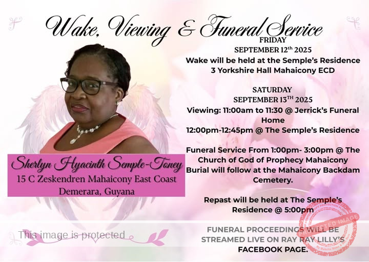 The community and family gathered to honor Sherlyn’s life with a heartfelt wake, viewing, and funeral service on September 12th and 13th, 2025. The wake was held at her residence, providing an opportunity for loved ones to pay their respects and reflect on the impact Sherlyn had on their lives. The funeral service was held at the Church of Prophecy Mahaicony, followed by a burial at the Mahaicony Backdam Cemetery, ensuring that she was laid to rest in a place surrounded by familiar faces and the love of her community.