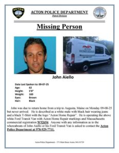 The Acton Police Department is urgently seeking the public’s assistance in locating 62-year-old John Aiello, who has been reported missing after failing to return from a trip to Augusta, Maine. John was last spoken to on Sunday, September 7, 2025, and was expected to return home the following day, Monday, September 8, 2025. Unfortunately, he never arrived, and concerns for his safety are growing. It is believed that he was last in the Westford, Massachusetts area on September 8.