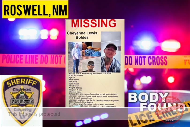 The Chaves County Sheriff’s Office has identified the body discovered south of Roswell, New Mexico, on October 17, 2025, as Cheyenne Lewis Boldes, born on July 18, 1991. Boldes had been reported missing a month earlier, on September 17, 2025.